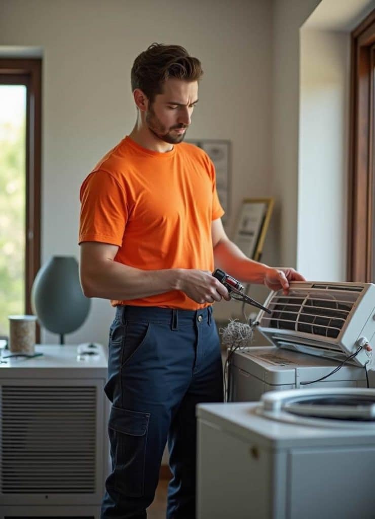 Técnico especializado reparando un aire acondicionado en Madrid, mostrando profesionalismo y dedicación para mantener su equipo en perfecto estado.